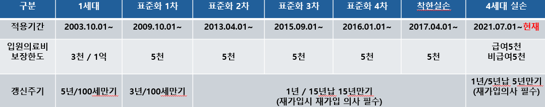 3천에서 1억을 보장하는 1세대 보험은 80세만기 100세만기 입니다. 입원시 본인부담금 없이 진료비 계산서에 청구된 보장대상의료비 100%를 보상합니다.표준화가 시행되면서 본인부담금이 10%로 시작되었고, 점차적으로 계속 본인부담금을 보험사는 늘려 현재 4세대는 급여는 80% 비급여는 70%만 보상해주고 있습니다. 본인부담금 한도도 4세대는 급여부분만 200만원 한도을 적용하고, 비급여는 제한이 없기 때문에 훨씬 더 예전에 비하면 보장이 축소된 것이 맞습니다.