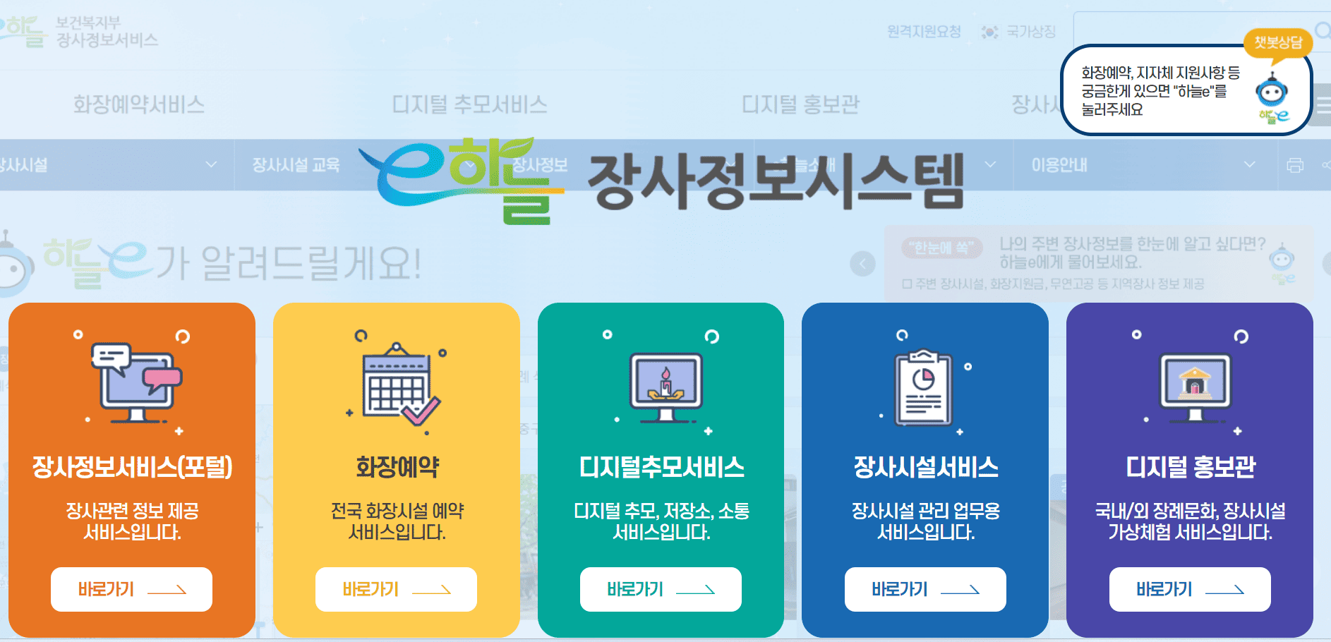 - e하늘 장사정보시스템 → 보건복지부 운영 / 문상 방법, 장례예절, 전국 화장시설 및 장례식장 검색, 예약 및 용품 가격 정보 제공