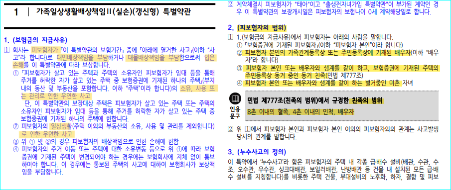 피보험자 본인이나 배우자 외에도 생계를 같이 하고, 보험증권에 기재된 주택에서 주민등록상 동거중인 8촌이내의