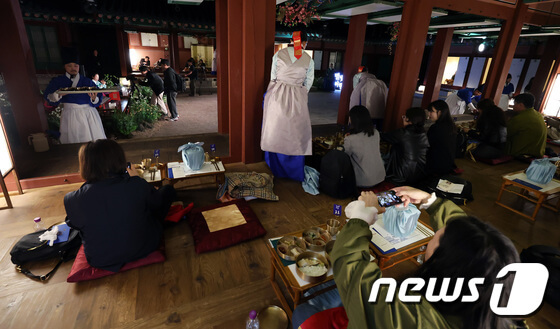 [별빛 산책로] - 소주방 --> 자경전, 함화당 --> 장고 --> 집옥재 --> 팔우정 --> 건청궁 --> 향원정 *(1부) 소주방 ~ 장고 : 궁중음식을 시작하고 장고에서 음식 관련 극을 감상 *(2부) 집옥재 ~ 향원정 : 고종의 이야기와 함께 경복궁 북측 권역 역사 탐방 - 외소주방 : 도슭수라상 궁중음식체험과 국악공연 관람 - 장고 : 장고마마와 나인의 작은 극 관람 - 집옥재, 팔우정, 건청궁 : 전각 및 내부 관람 - 향원정 : 취향교 건너 특별 관람 |