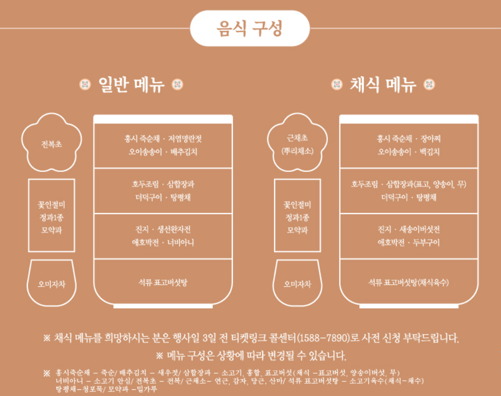 [도슭수라상] 귀한 손님을 위해 수라상을 내올리다. '도슭'은 도시락의 옛말로 왕과 왕비에게 올리던 최고의 일상식인 12첩 반상을 현대적으로 해석해 유기 도시락에 정갈히 나누어 담아낸 음식입니다. -음식 구성- *일반식 4단 : 홍시죽순채, 저염명란젓, 오이송송이, 배추 김치 3단 : 호두조림, 삼합장과, 더덕구이, 탕평채 2단 : 진지, 생선완자전, 애호박전, 너비아니 1단 : 서류 표고버섯탕 -꽃벌찬 : 전복초 -후식 : 꽃약과, 도라지정과, 콩송편, 곶감수정과 *채식 4단 : 홍시죽순채, 장아찌, 오이송송이, 백김치 3단 : 호두조림, 삼합장과, 더덕구이, 탕평채 2단 : 진지, 새송이버섯전, 애호박전, 두부구이 1단 : 석류 표고버섯탕(채식육수) -꽃벌찬 : 근채초 -후식 : 꽃인절미, 정과, 모약과, 오미자차 *채식메뉴를 희망하시는 분은 행사일 3일 전 티켓링크 콜센터(1588-7890)으로 사전 신청 부탁드립니다. |
