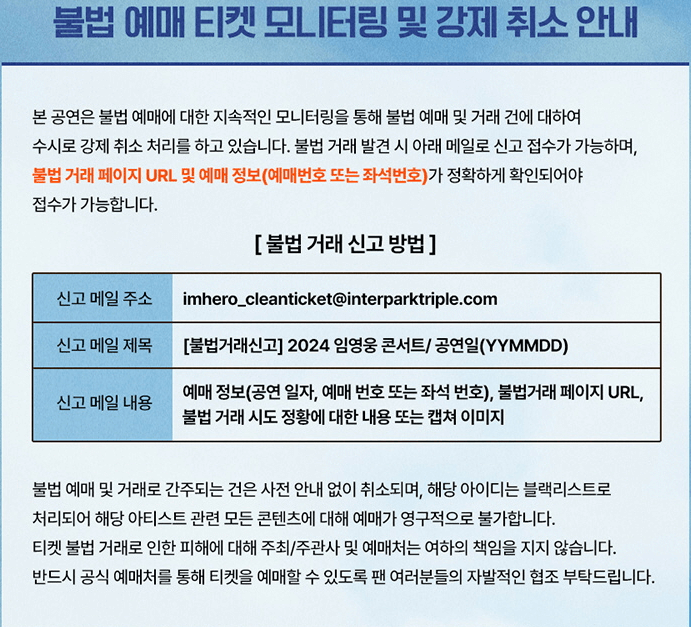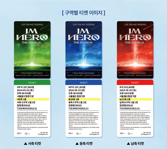 ※ 휄체어석 예매 : 2024년 4월 11일(목) 오전 9시부터 인터파크 티켓 고객센타(1544-1555) 또는 2024 임영웅 콘서트 전용 ARS 고객센타(1660-1646)를 통해 전화 예매로만 가능(운영시간 : 09:00~18:00)